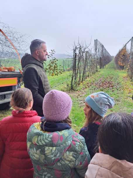 Nach einer freundlichen Begrüßung durch Josef und Karin durften wir den weitläufigen Apfelgarten erkunden. Zwischen den langen Reihen der Apfelbäume erfuhren die Kinder, wie ein Apfelbaum übers Jahr gepflegt wird, welche Arbeitsschritte nötig sind und wie wichtig Wetter und Boden für eine gute Ernte sind.