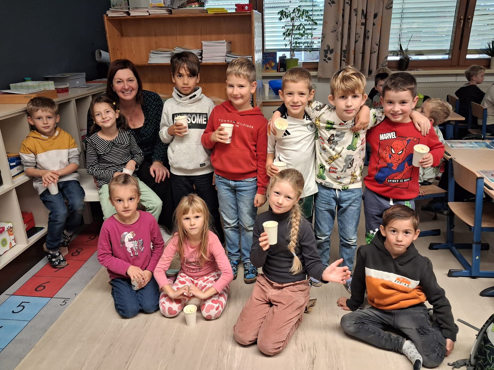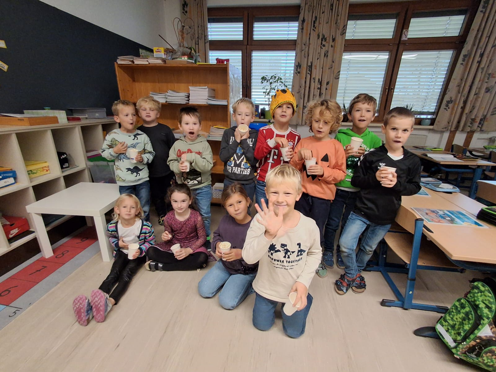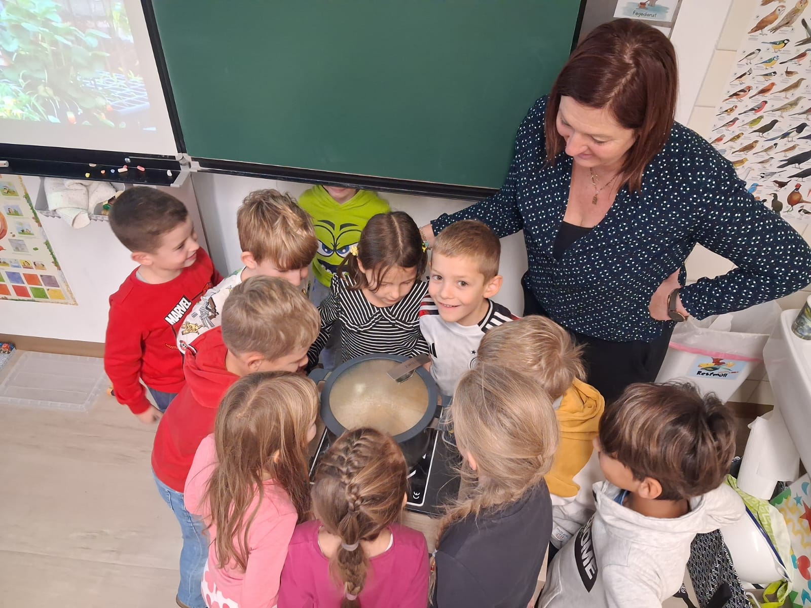 Als Motivation und Belohnung für ihren Fleiß durften die Kinder der 1. Klasse Popcorn zubereiten. Werklehrerin Michaela Huber und ihre Schützlinge ließen es sich schmecken.
